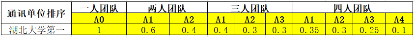 其中A0为唯一排名第一,A1为排名第一,A2为排名第二,A3为排名第三......,以此类推若竞赛奖励团队成员大于4人,则依据署名排序分别乘以权重系数为0.5n(n为团队成员排序)。