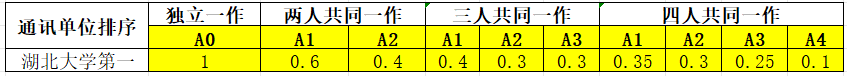 其中A0为独立一作,A1为共同一作排序第一,A2为共同一作排序第二......,以此类推,该计算方式也适用于团队竞赛成果。